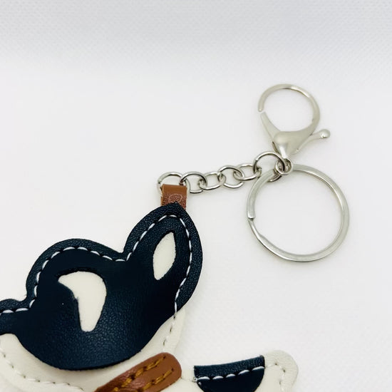 French Bulldog keychain. Black and white dog with strap and carabiner.