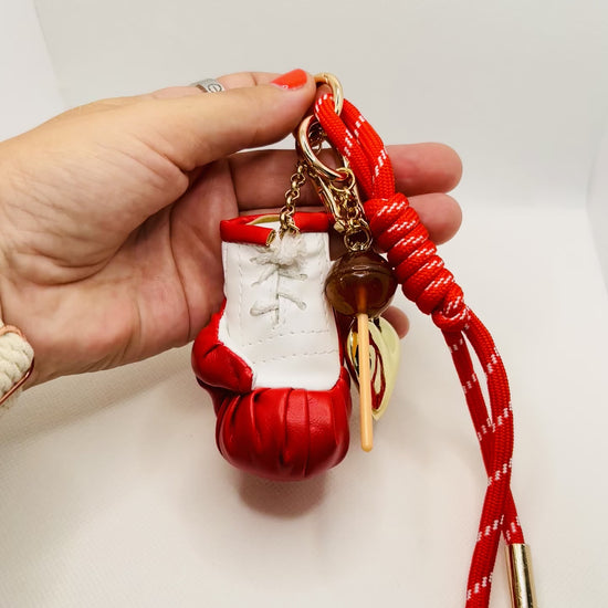 Boxhandschuh Schlüsselanhänger mit Lolli & Herz. Rotes PU-Leder Accessoire für Damen