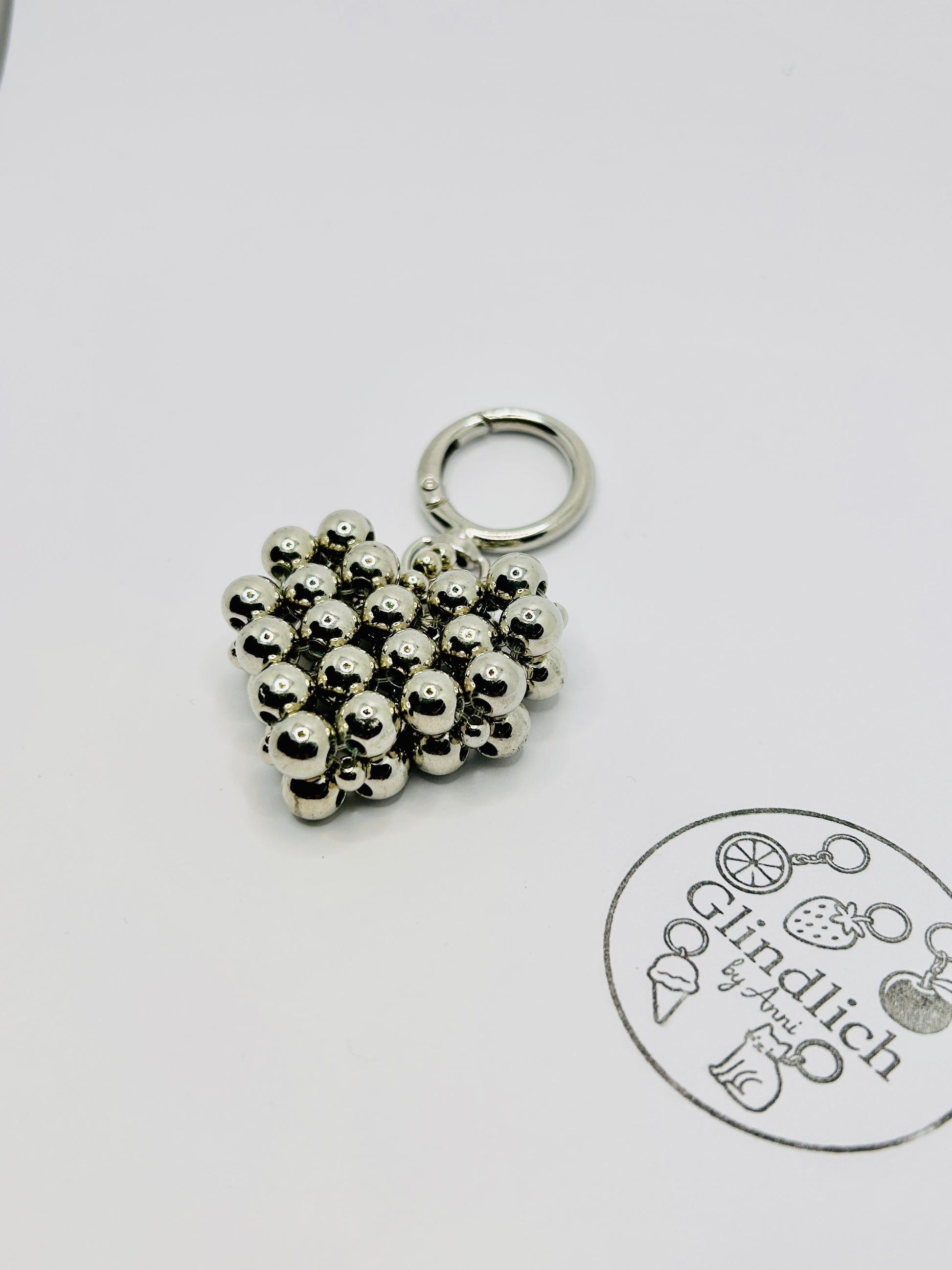 Ein Herz, das glänzt. Der silberfarbene Taschenanhänger aus glänzenden Metallperlen verleiht jeder Tasche oder jedem Schlüsselbund eine elegante, moderne Note. Durch die strukturierte Oberfläche entsteht ein dezentes Spiel aus Licht und Bewegung. Schlicht, aber wirkungsvoll.