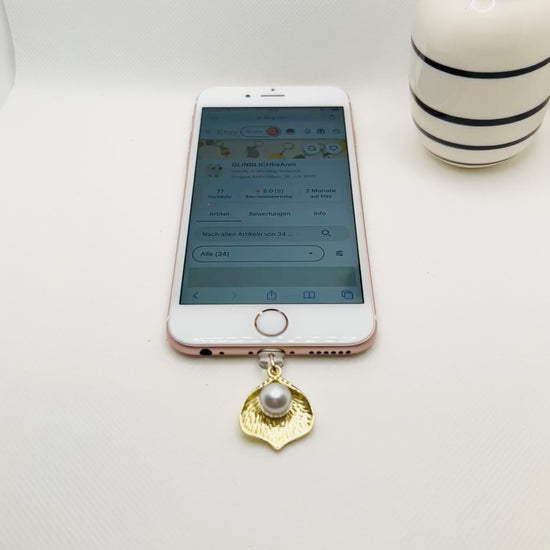 Handy Charm Gold mit Perle. Smartphone Anhänger Staubschutz Schmuck Accessoire