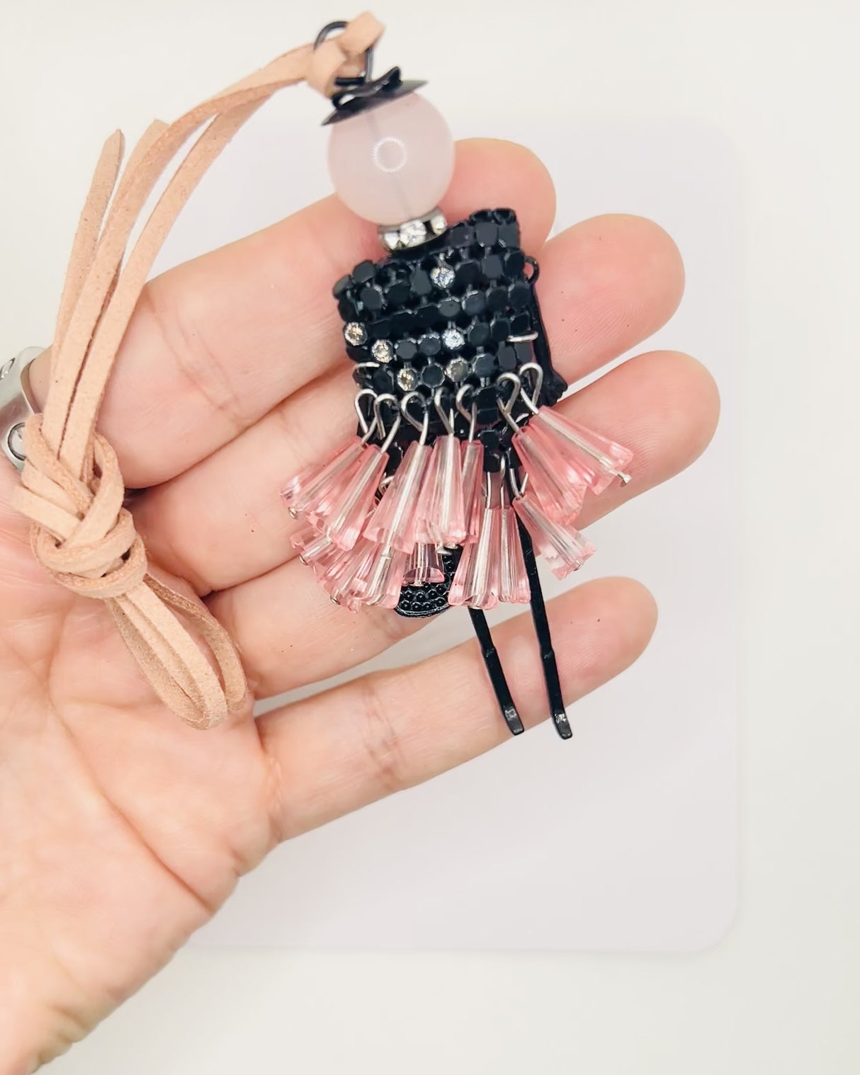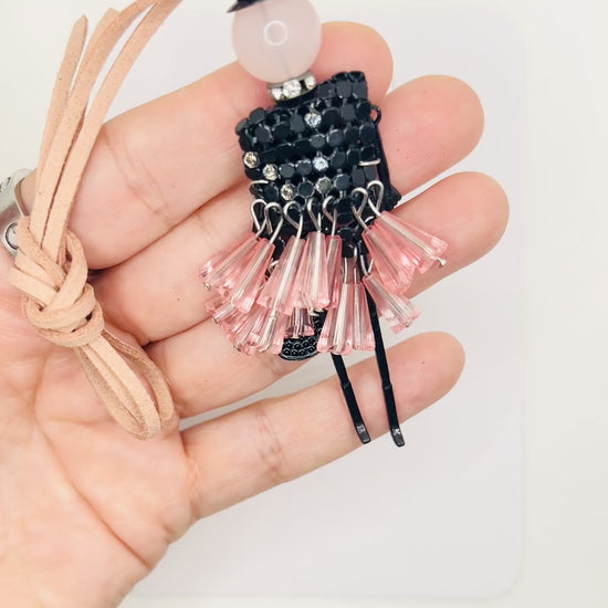 Taschenanhänger Puppe mit Perlenrock. Anhänger in Pink & Rot. Für Tasche oder Rucksack. Geschenk für Damen